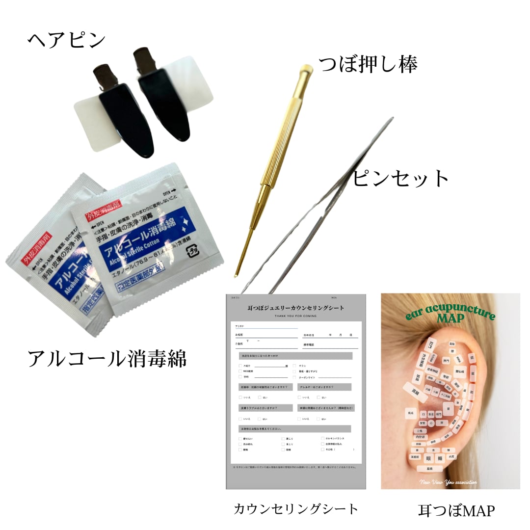 【NATSUMI監修】 スターター6点セット ◼️内容◼️ ・耳つぼプッシャー ・アルコール除菌綿 ・ヘアピン ・ピンセット ・カウンセリングシート ・耳つぼMAP (『見ながら施術できるから安心!』とご好評いただいております) ◼️ご注意◼️ ピンセット、耳つぼプッシャー、ヘアピンのデザインやカラーはお選びいただけません。
