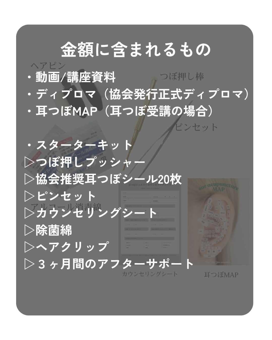 初めて受講される方には、動画講座に加え、すぐに実践いただけるスターターキットをお届けします。学習後には**ディプロマ(修了証)**をお申し込みのお名前で発行いたします。